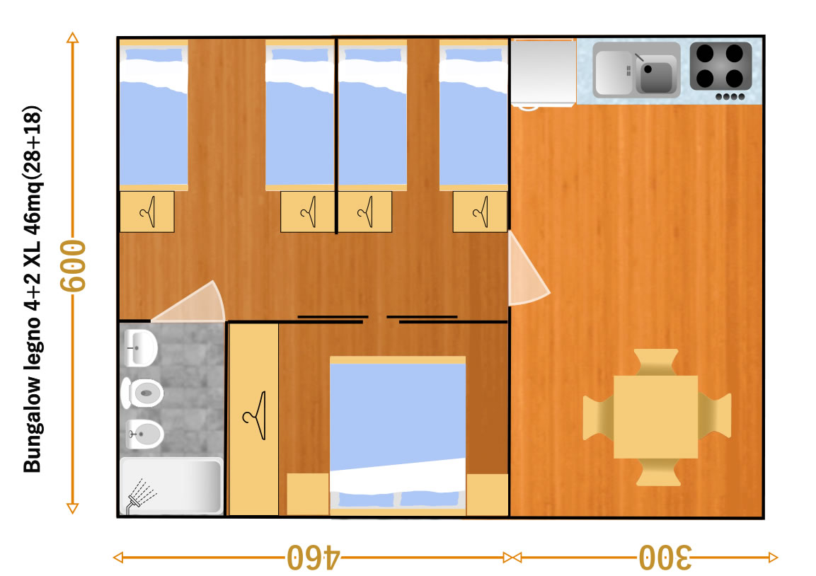 Il Bungalow Legno 4+2 XL è la soluzione più ampia del villaggio, ideale per famiglie numerose o gruppi fino a 6 persone che desiderano una vacanza all’insegna dello spazio e della comodità.