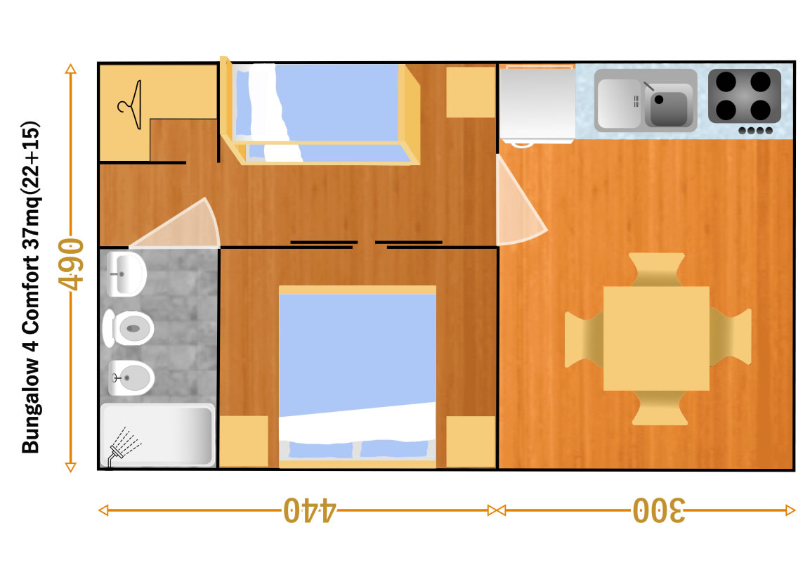 È composto da camera matrimoniale, cameretta/ingresso con letto a castello, bagno privato e una veranda esterna coperta con angolo cottura, tavolo e sedie, perfetta per pranzare all’aperto o rilassarsi in totale comodità.